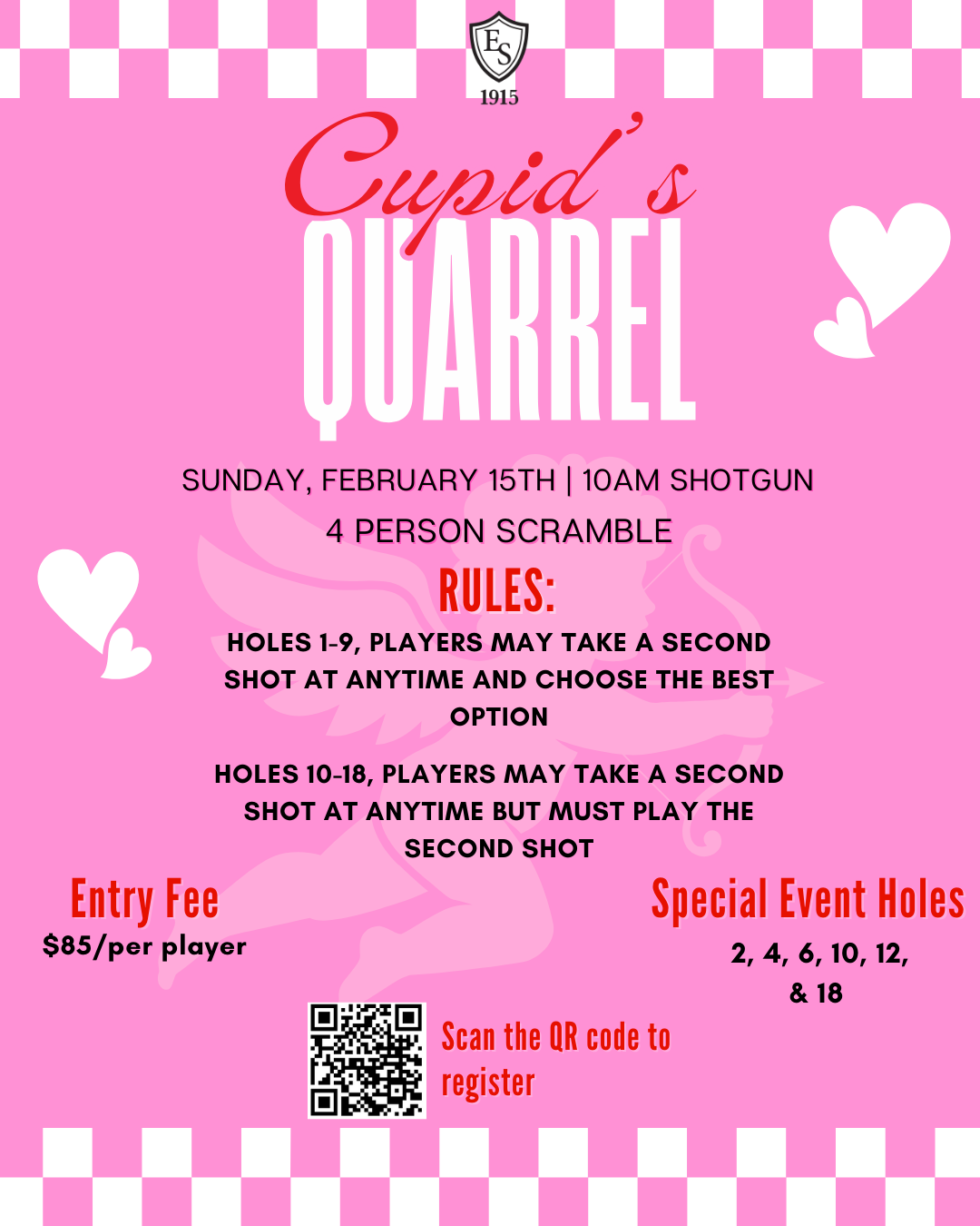 Register today for Cupid's Quarrel! 4-person scramble with a 10 am Shotgun. Holes 1-9 players may take a second shot at anytime and choose the best option Holes 10-18 players may take a second shot at any time, but must play the second shot